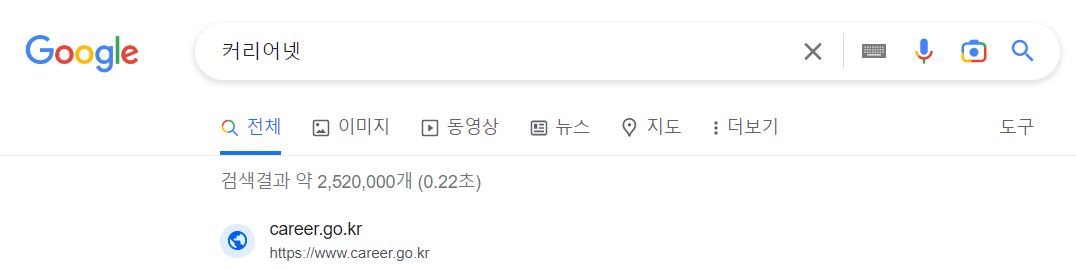 구글이나 평소 이용하는 검색창에 커리어넷을 입력한 후 검색하면 커리어넷 홈페이지 주소 (https://www.career.go.kr)가 나옵니다. 여기에서 커리어넷 홈페이지 이용이 가능합니다.