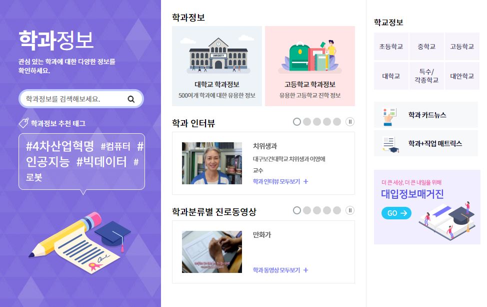 다음으로는 관심 있는 학과에 대한 다양한 정보를 확인할 수 있는 학과 정보 서비스가 있습니다. 대학교, 고등학교 학과정보를 확인할 수 있으니 관심 있는 분들은 이용하시기 바랍니다.