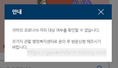 6) 간혹 코로나에 확진되었음에도 아래처럼 격리 대상 여부가 정부 24에 등록되어있지 않는다고 나오는 경우에는 주거지 관할 행정복지센터로 문의하면 되고, 만약 격리 대상 여부가 바로 확인이 된 경우 절차에 따라 신청하면 됩니다.