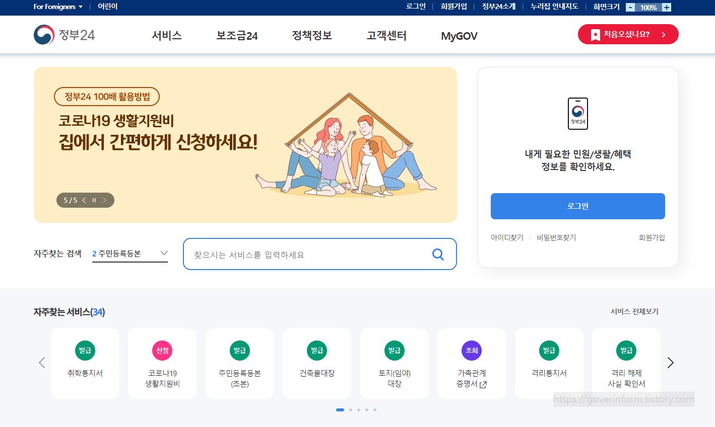 1) 먼저 정부 24 홈페이지에 접속합니다. (정부 24: https://www.gov.kr/portal/main)
