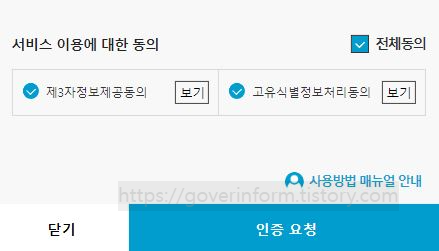 2- 서비스 이용에 대해 동의를 합니다. 제삼자 정보제공 동의와 고유 식별정보처리 동의 두 가지를 선택해야 인증을 할 수 있습니다. 전체 동의를 하고 인증 요청을 합니다.