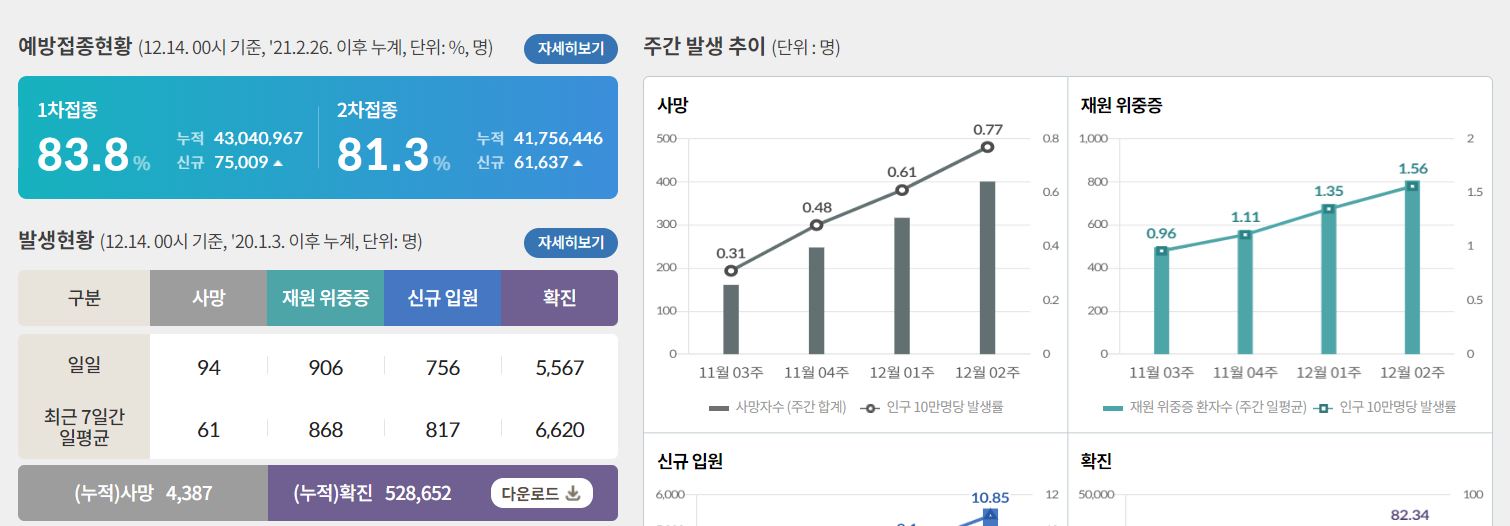 코로나 발생 현황에 대해 보건복지부에서는 실시간으로 발생현황, 병상 현황, 주간 발생 추이를 발표하고 있습니다.