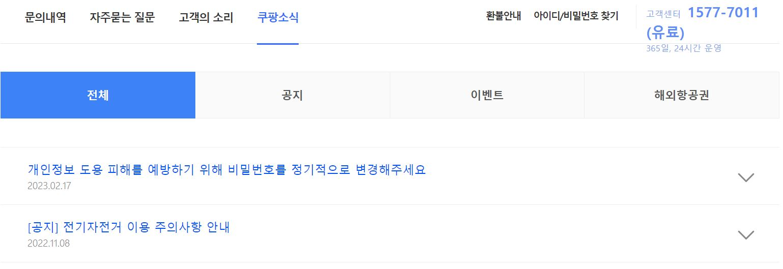 쿠팡 고객센터 홈페이지에는 쿠팡 소식(공지사항 또는 이벤트)을 볼 수 있다.