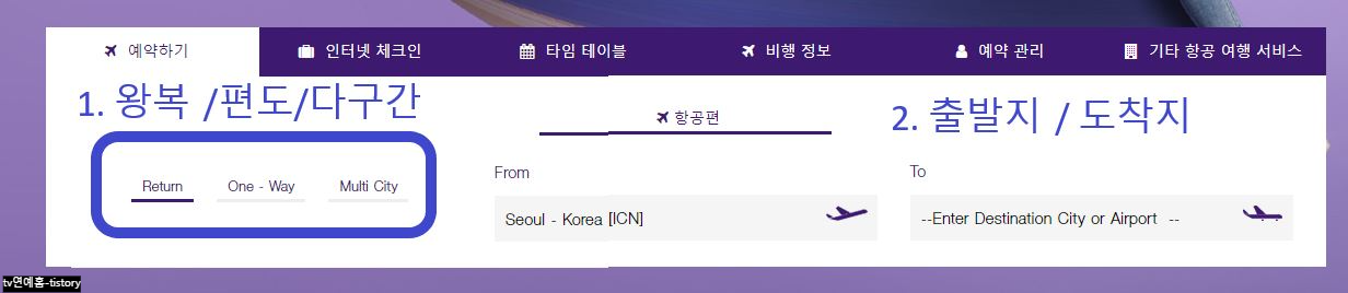 1. 타이항공 홈페이지 첫화면에서 하단으로 내려가다 보면 '예약하기' 메뉴가 있습니다. 예약하기 메뉴에서 1. 왕복 / 편도 / 다구간 중 선택 2. 출발지 / 도착지 선택을 하고 아래 단계로 넘어갑니다.