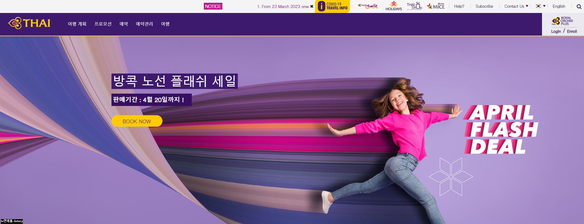 아래는 타이항공 홈페이지의 첫 화면입니다.