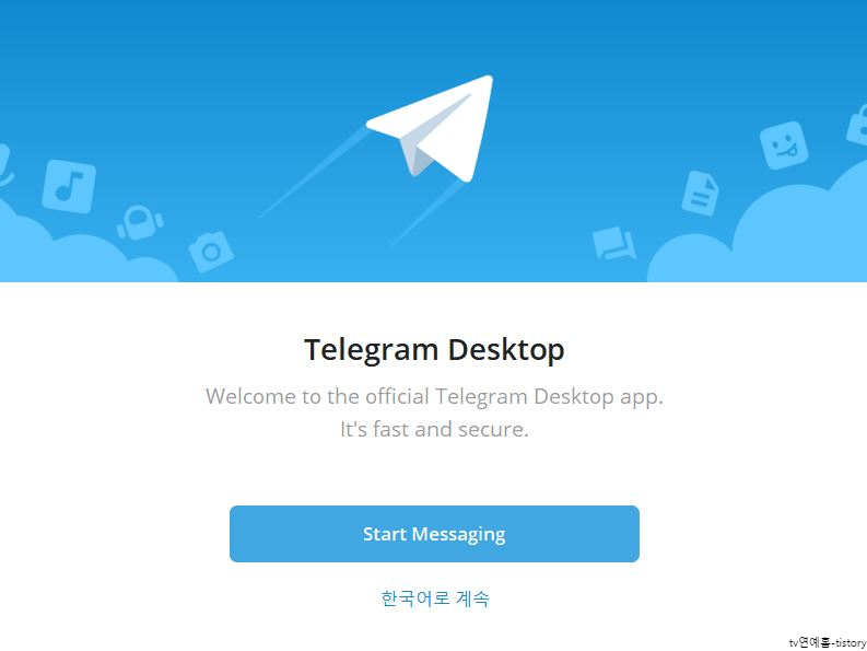 텔레그램 PC버전 설치가 완성되면 다음처럼 텔레그램 메신저 화면이 나옵니다. 마무리 창에서 한국어로 선택할 수 있는 문구가 나오며 한국어 이용을 원할 시 한국어로 계속을 터치합니다.