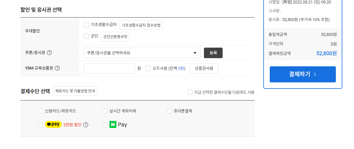 5) 할인 및 응시권에 해당사항이 있는 경우 확인하여 체크하면 혜택을 받을수 있다. 없으면 공란으로 두면 된다. 하단 결제수단 선택후 우측 결제하기 버튼 누르면 된다.