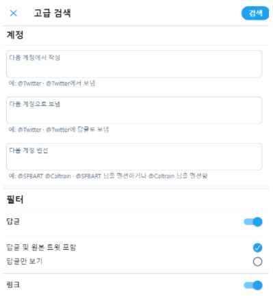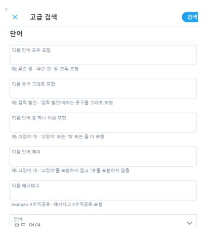 트위터에는 고급 검색 기능이 있는데 이 기능을 이용할 때는 PC버전 트위터에서 사용 가능함을 미리 알려 드립니다. 고급 검색은 특정 단어, 검색어를 입력하여 검색한 후에 추가로 필터링을 하는 기능으로 이용을 원하는 경우 우측 고급 검색 기능을 터치합니다.