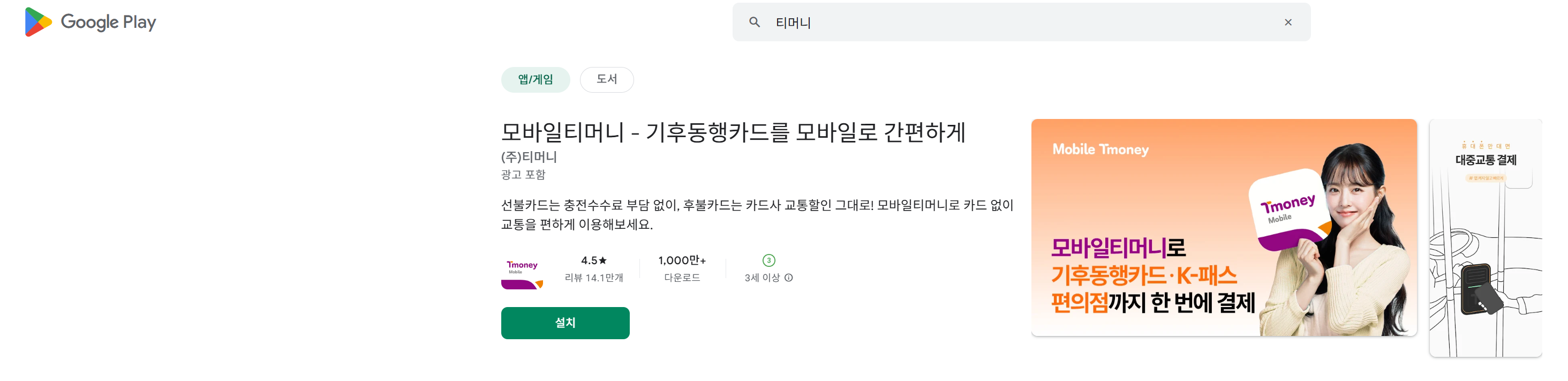 안드로이드(또는 iOS) 기반 스마트폰에서 '앱스토어' 접속 후 '모바일 티머니'를 검색하여 앱을 설치합니다.