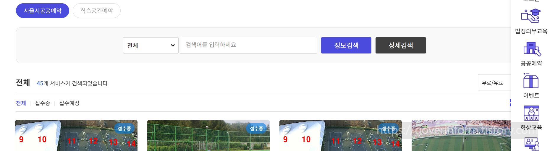 학습지원센터는 공지사항 문의하기 공공예약 이벤트 시민참여마당 자료실 서비스가 있습니다. 공공예약서비스는 45개의 공공시설 예약이 가능하고 이용을 희망하는 공공서비스를 터치하면 사용료 예약방법 이용료 감면 혜택 주의사항 안내를 열람 가능합니다.
