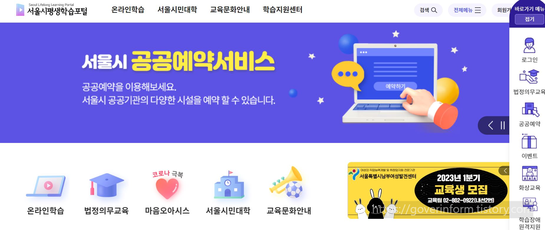 서울시평생학습포털 로그인 방법은 하단의 계정으로 시작하기 할 수 있습니다. 19.5.16 서울시 홈페이지 조례 계정 관련 서울시 통합 로그인시 적용되던 마일리지 적립이 중단되었고 평생학습포털도 포인트 적립이 중단되었습니다.