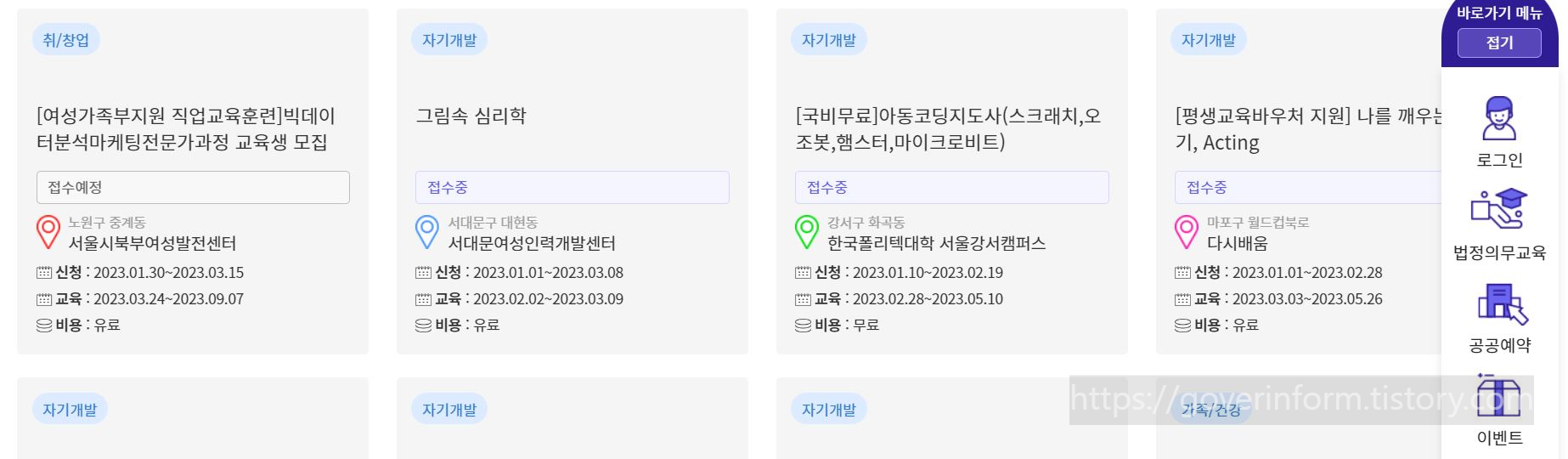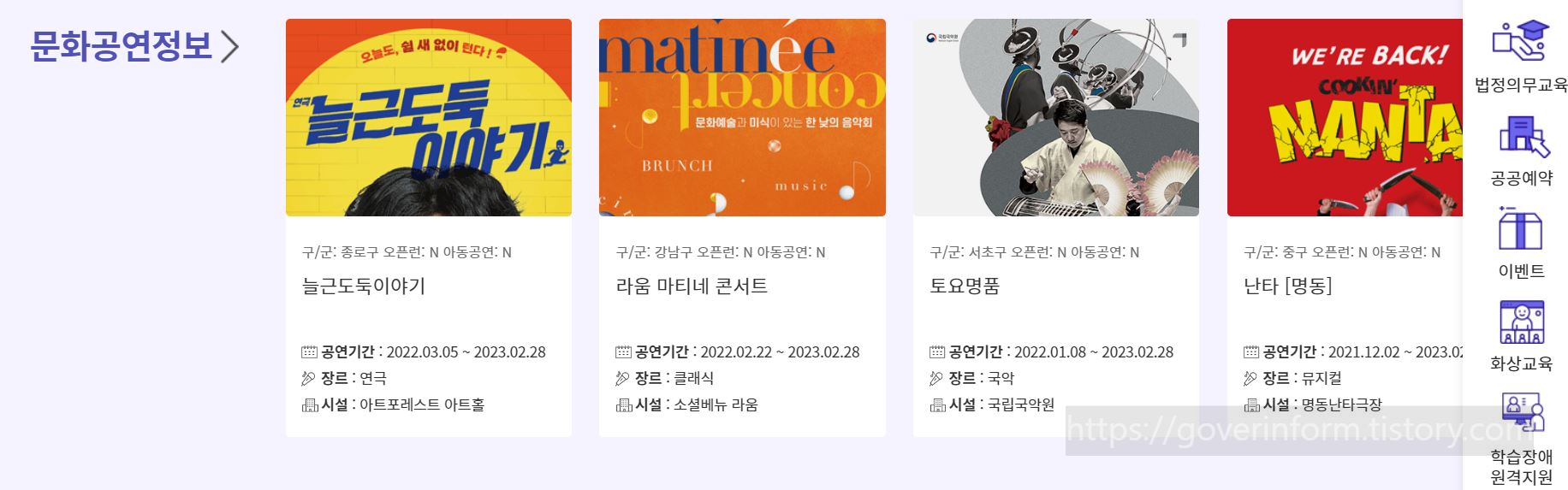 문화예술공연정보를 볼 수 있는 것이 서울시평생학습포털의 특징인데요 서울시평생학습포털>문화공연정보 순으로 접그하면 공연 위치 공연기간 공연시간 공연대상 공연요일 비용 상시 열람 가능합니다.