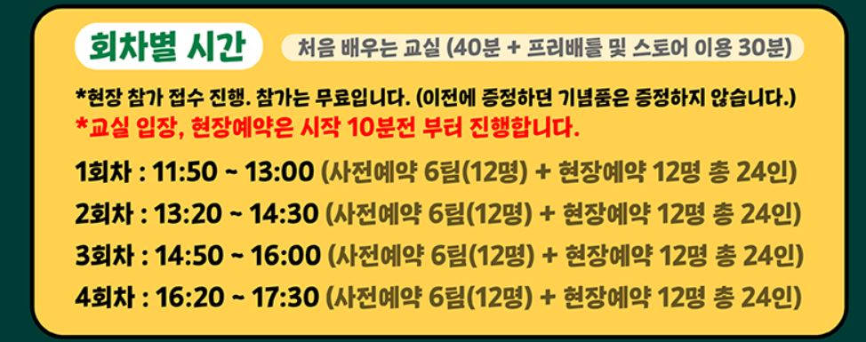 회차별 시간을 확인하고 원하는 회차를 예약하고 해당일, 시간에 방문하면 되는데 워크인(예약없이 방문)은 잔여석이 있더라도 현장 접수 불가 합니다. 반드시 예약을 하고 방문해야 합니다.