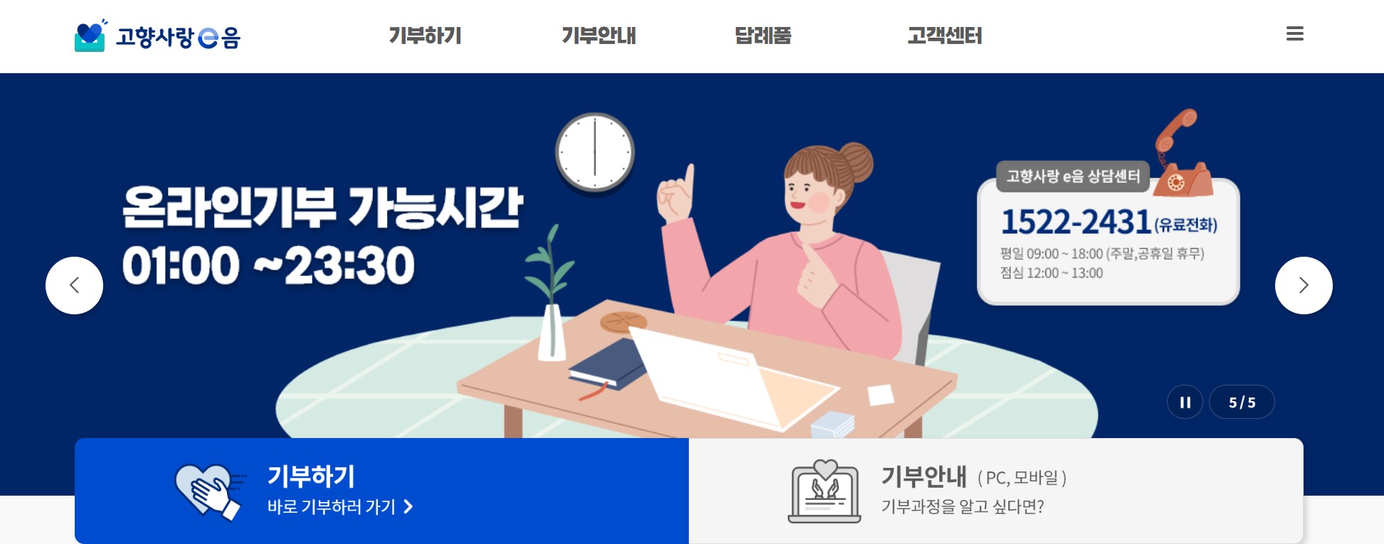 기부 방법은 고향사랑 e음 홈페이지 ilovegohyang.go.kr에서 01:00 ~ 23:30 이내에 할 수 있으며 기부 과정도 확인할 수 있습니다!