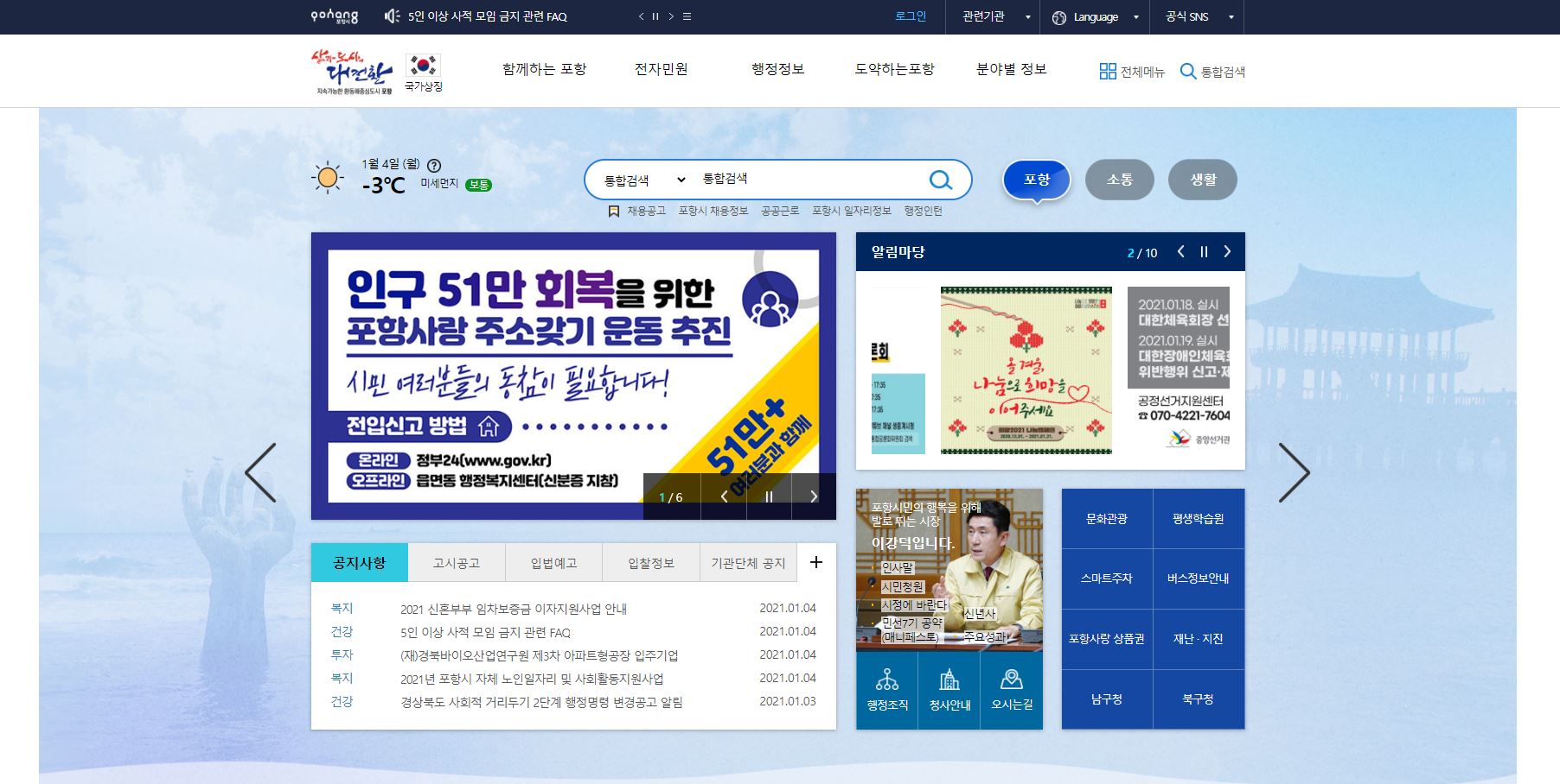 포항시청은 스마트 그린도시로 선정될만큼 우리나라에서 각광받고 있는 도시입니다. 홈페이지 역시 많은 정보로 가득차있습니다.