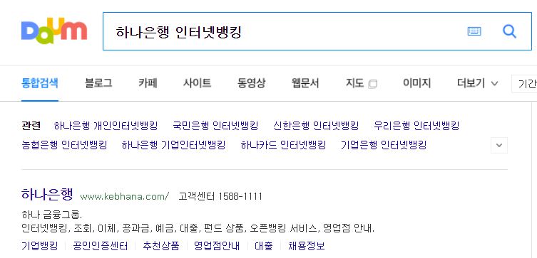 간단하게 하나은행 인터넷뱅킹에 접속하는 방법은 두가지입니다. 첫번째는 포털사이트검색창에 하나은행 인터넷뱅킹이라고 검색하면 상단에 주소가 나옵니다.