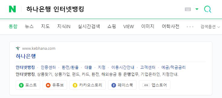 간단하게 하나은행 인터넷뱅킹에 접속하는 방법은 두가지입니다. 첫번째는 포털사이트검색창에 하나은행 인터넷뱅킹이라고 검색하면 상단에 주소가 나옵니다.