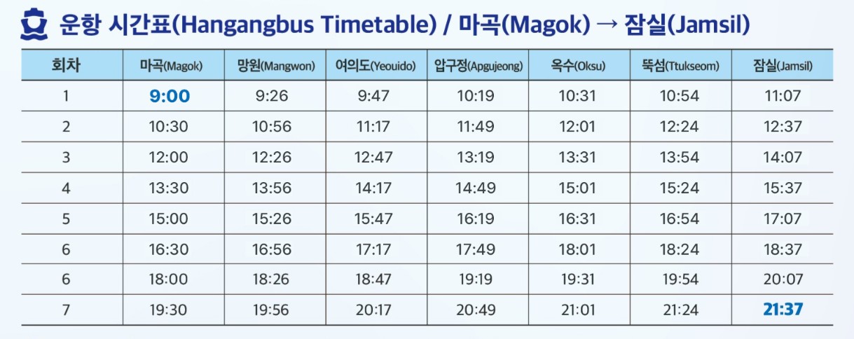 정차 순서: 마곡 ↔ 망원 ↔ 여의도 ↔ 잠원 ↔ 옥수 ↔ 뚝섬 ↔ 잠실