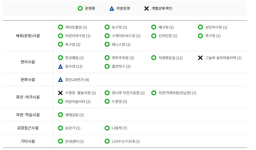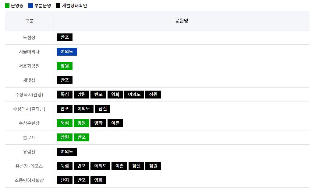 수상, 레저를 즐길 수 있는 시설의 운영현황을 확인할 수 있습니다. 시설명 터치 시 해당 시설의 위치를 확인할 수 있습니다.(한강사업본부홈페이지> 수상레저에서 확인가능)