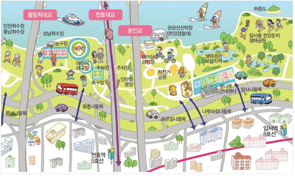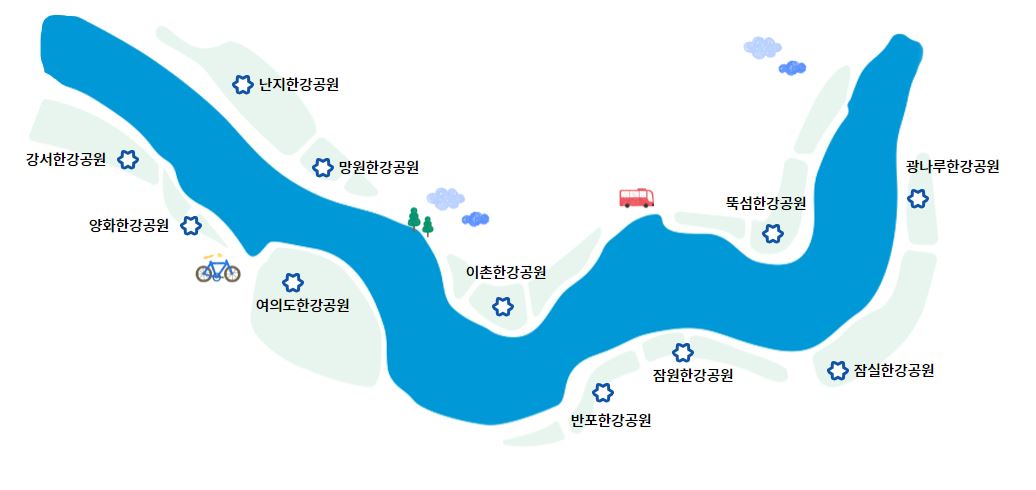 한강공원은 한 곳에만 있는 게 아니라 여러 개가 있으며 동쪽부터 광나루 한강공원, 뚝섬한강공원, 잠실한강공원, 잠원한강공원, 반포한강공원, 이촌한강공원, 여의도 한강공원, 망원한강공원, 양화한강공원, 난지한강공원, 강서한강공원이 있습니다.