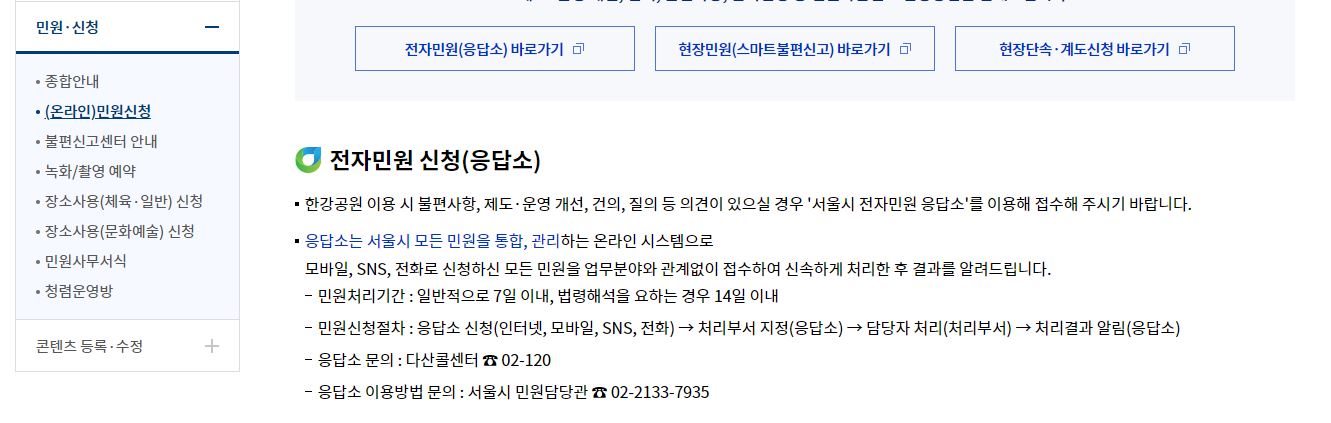 한강과 관련한 민욱은 한강사업본부 홈페이지에서 이용 가능합니다. 민원은 불편사항, 제도운영개선, 건의, 질의 등이 해당하며 한강사업본부 홈페이지> 참여민원에서 이용 가능하오니 참고하시기 바랍니다. 신청은 녹화, 촬영 예약이나 장소사용신청(체육, 일반, 문화예술)을 할 수 있습니다.