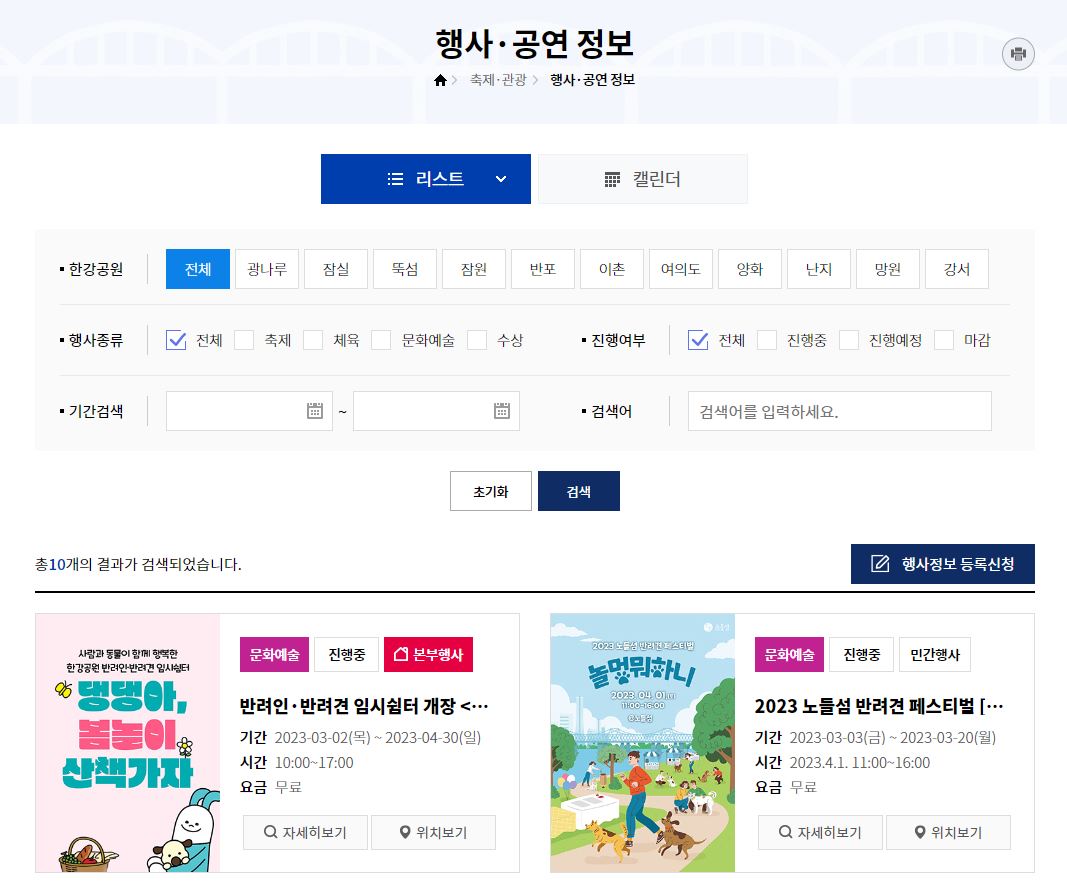 한강공원에서 진행되는 축제, 관광정보도 있습니다. 한강공원 선택도 가능하며, 축제 체육 문화예술 수상 등 행사종류 선택, 진행중, 진행예정, 마감된 축제정보 확인 선택 및 기간검색으로도 조회가 가능합니다.