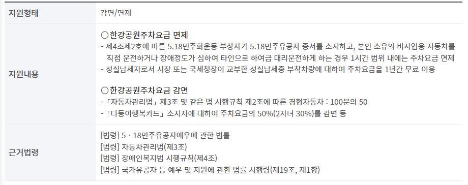 한강 지역 부근 주차장은 주차요금 감면제도를 시행하고 있습니다. 주차요금 감면은 주차장 이용시 조례 및 조례시행규칙에 따라 요금 감면 및 할인 혜택을 받는것으로 하단 지원내용에서 해당되는 사항이 있는지 확인후 이용 가능합니다.