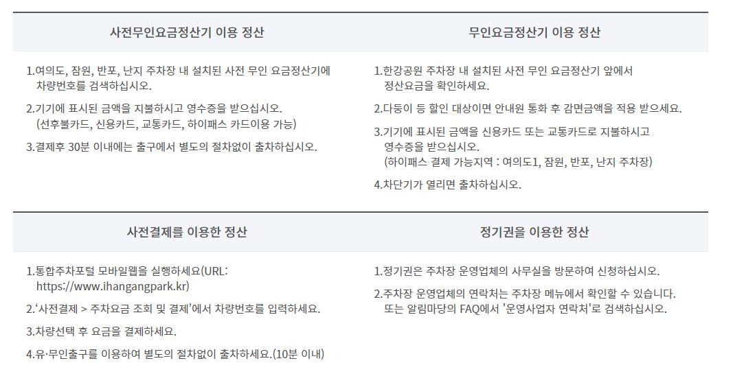 관련하여 상세하게 내용을 확인하고 싶다면 하단 한강주차포털에 방문하시어 확인하시기 바랍니다. 이용중 문의사항이 있는 경우 하단에 댓글을 남겨주시기 바랍니다.