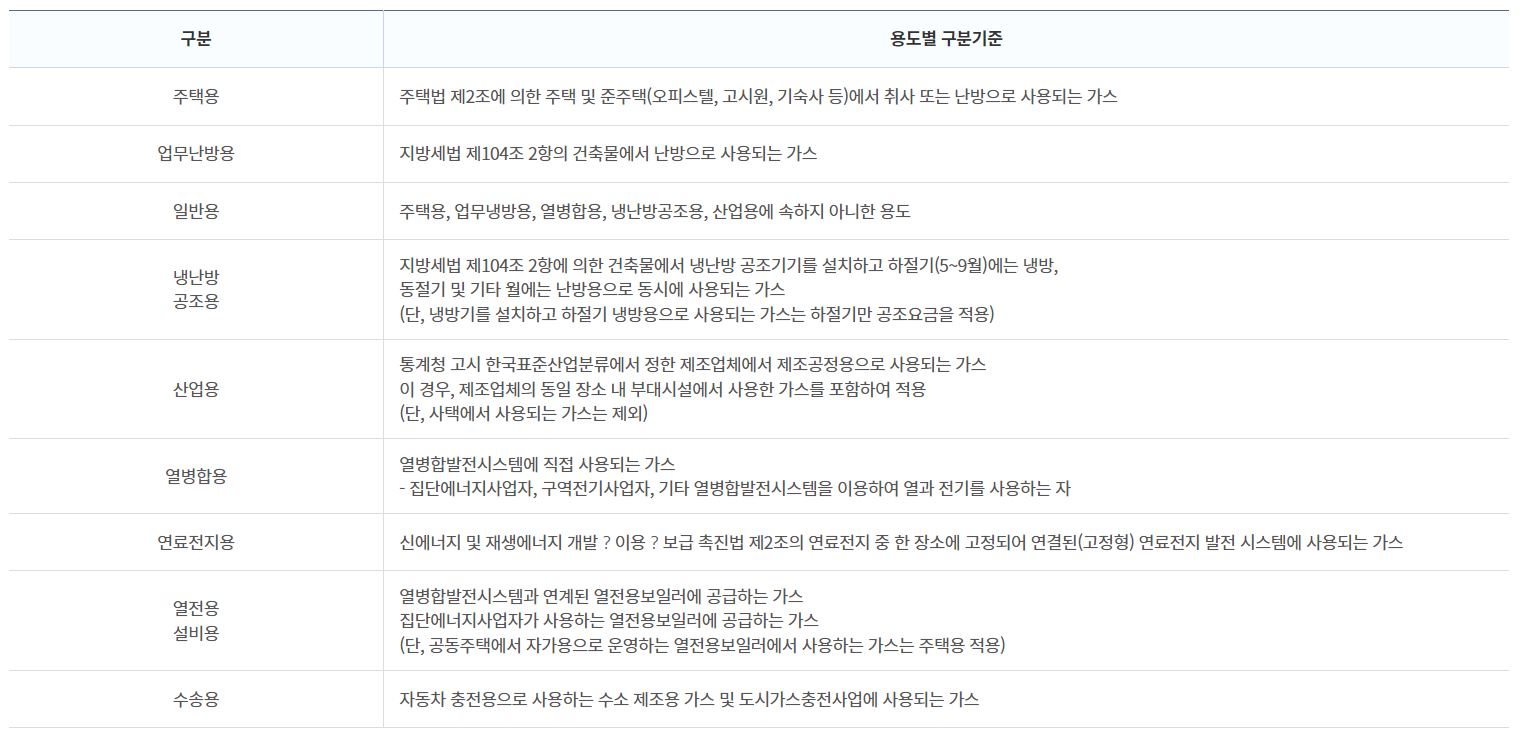 도시가스 용도별 구분기준은 주택용, 업무난방용, 일반용, 냉난방 공조용, 산업용, 열병합용, 연료전지용, 열전용, 설비용, 수송용입니다.