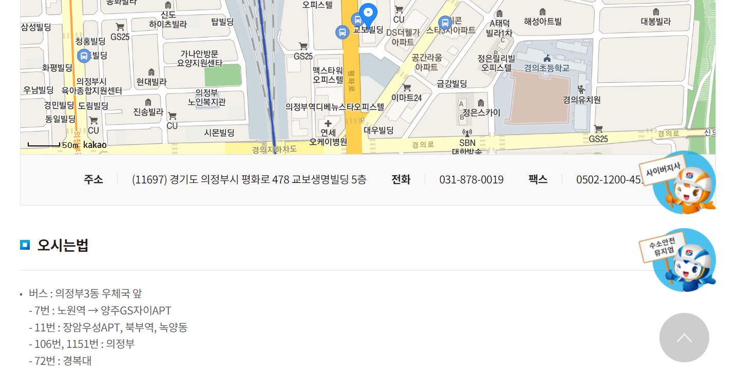 검색결과는 하단과 같으며 광역본부 지사에 나와있는 지사를 터치 시 해당지사 지도와 함께 주소, 전화, 팩스, 오시는 법, 주차시설에 대한 안내를 합니다.