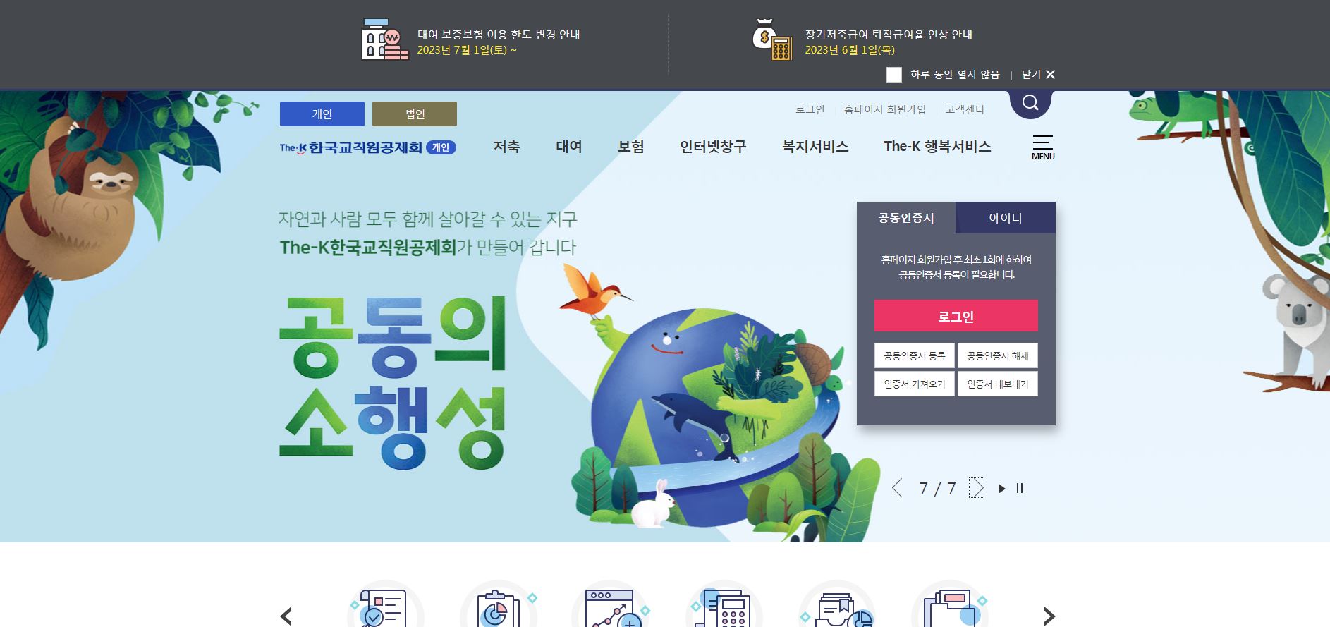 한국교직원공제회 홈페이지 첫 화면(메인화면)입니다. 저축, 대여, 보험, 인터넷창구, 복지서비스 등 다양한 혜택이 준비되어 있습니다.