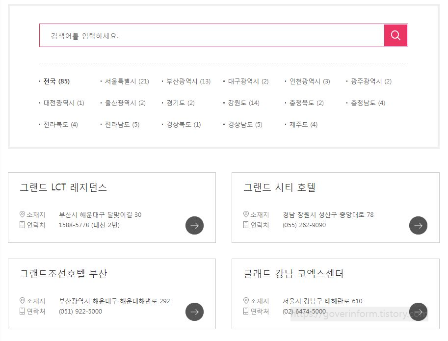 위 주소를 터치하면 전국에 있는 85개의 리조트와 호텔을 볼 수 있습니다. 정상요금에서 할인된 이용 금액도 위 주소에서 확인할수 있습니다. 항공.기차.쏘카.골프장.기타시설(아쿠아리움.케이블카.곤돌라.스파) 할인혜택도 있습니다.