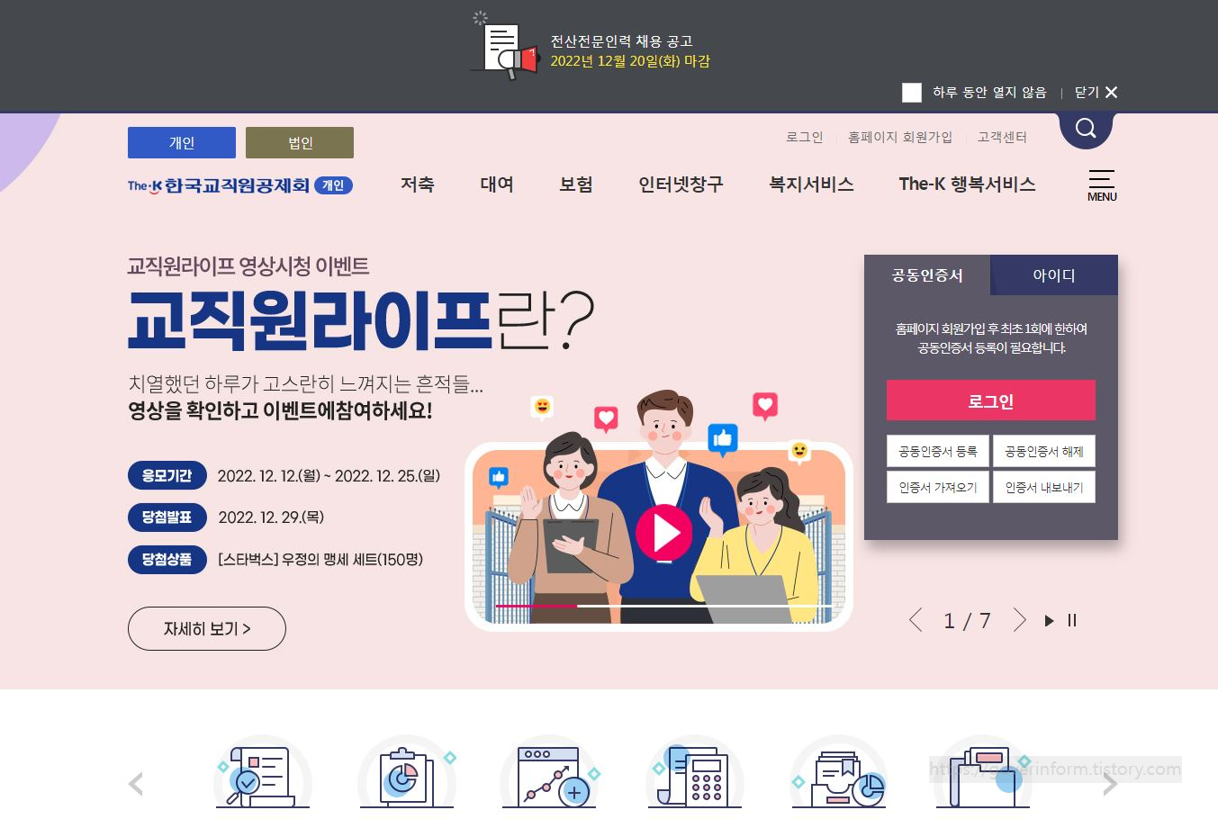 아래 보이는 페이지는 한국교직원공제회 홈페이지의 첫화면으로 저축.대여.인터넷창구 등의 메뉴와 "복지서비스"메뉴가 있습니다. 복지서비스를 많은분들이 궁금해합니다. 교직원이더라도 복지서비스에 어떤것이 있는지 잘 알아야 이용할수 있습니다.