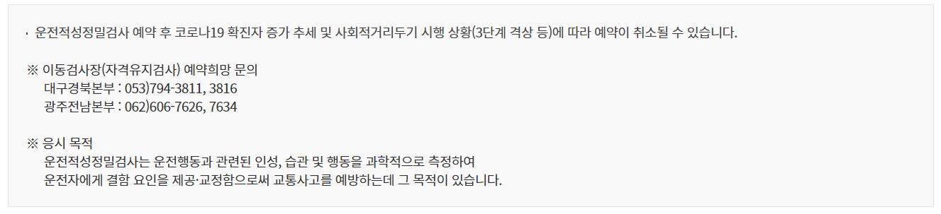 자동차검사 예약 외에도 운전적성정밀검사 서비스가 있습니다. 운전정밀검사 서비스 역시 예약을 해야하며 검사종류(신규, 특별, 자격유지, 군운전적성정밀) 선택, 예약자 확인사항, 검사장 예약일시 선택, 신청서 작성, 접수완료 순으로 이용해야 합니다. 운전적성정밀검사는 최초취업자의 경우 희망업종(시내, 시외, 전세, 고속버스 등)을 선택합니다. 운전적성정밀검사 예약 후 검사예약확인이 가능합니다.(하단 한국교통안전공단 홈페이지 바로가기 참고)