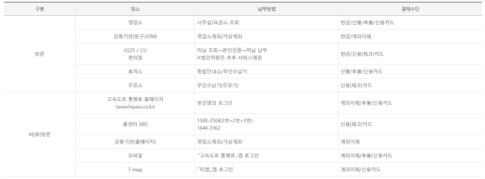한국도로교통공사에서는 미납통행료 납부안내를 하고 있습니다. 미납 상세내역을 확인할 수 있으며 인터넷 납부가 가능하며 방문, 비방문 중 편한 방법으로 이용이 가능합니다. 방문을 하는 경우 영업소, 금융기관, 편의점(CU), 휴게소, 주유소를 이용하면 되고, 비방문은 고속도로 통행료 홈페이지, 콜센터 ARS, 금융기관(홈페이지), 모바일, T-map에서 이용 가능합니다. 단 납부기간이 경과한 경우 가까운 영업소나 콜센터로 문의해야 납부가 가능합니다.