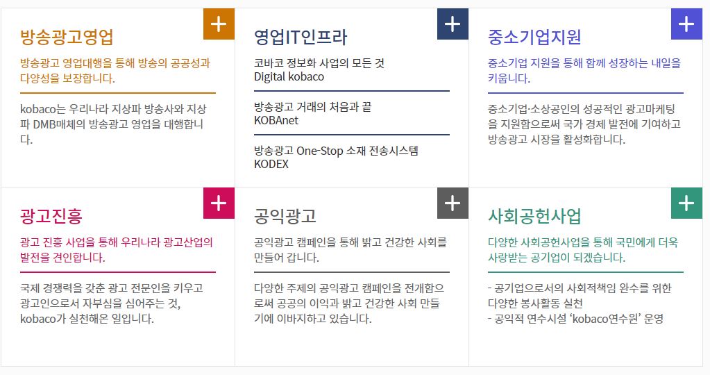 한국방송광고진흥공사가 하는 일은 다음과 같습니다. (방송광고영업, 영업it인프라, 중소기업지원, 광고진흥, 공익광고, 사회공헌사업)