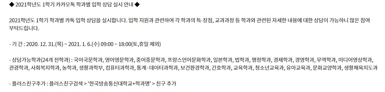 코로나로 인해 아무래도 많은 곳에서 상담인력도 줄었기 때문에 한국방송통신대학에서는 많은 분들이 이용하고 있는 카카오톡으로 상담을 실시하고 있습니다.