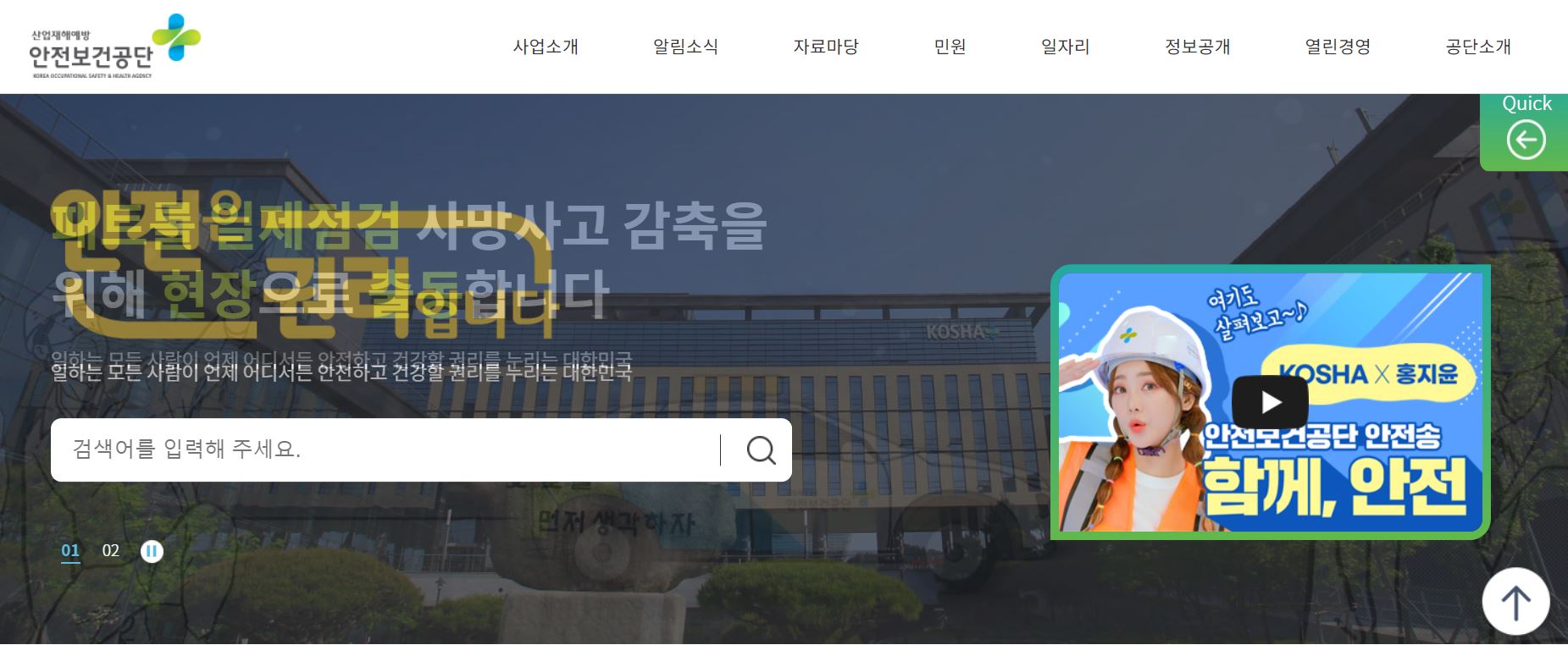현대사회의 빠른 변화는 매해 반복적으로 발생하는 안전문제로 인해 국민들의 안전에 대한 요구가 더욱 높아지고 있고 이에 따라 한국산업안전공단처럼 안전보건 환경변화에 능동적으로 대처하고, 국민과 우리 사회의 기대 수준을 넘어서기 위한 선도적인 대응이 필요합니다. 홈페이지에서 필요한 정보를 찾으시기 바랍니다. 많은 도움이 될 것입니다.