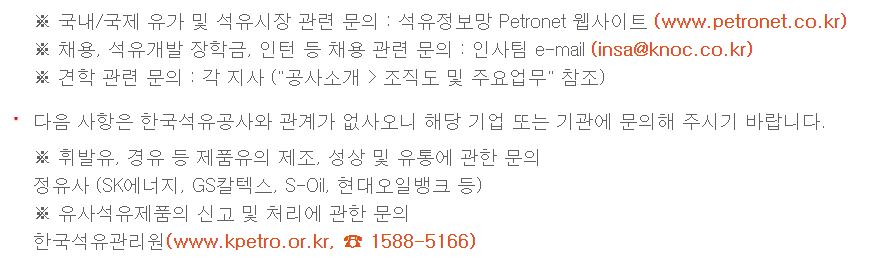 다음 사항은 한국석유공사 고객상담실과 상관없는 내용이므로 해당 사항과 관련있는 기업, 기관에 문의하시기 바랍니다. 휘발유, 경유 등 제품유의 제조나 성상 유통에 대한 문의-정유사(SK에너지 등) 유사석유제품 신고나 처리에 대한 문의-한국석유관리원입니다. 아울러 국내 국제 유가 및 석유시장 관련 문의는 석유정보망 사이트, 채용 석유개발 장학금 인턴 등 채용관련 문의는 인사팀 견학관련 문의는 각지사 공사소개를 참고하시기 바랍니다.