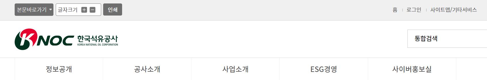 한국석유공사 홈페이지 첫화면은 하단과 같으며 한국석유공사에 대한 소개 및 석유에 대한 정보가 있습니다.
