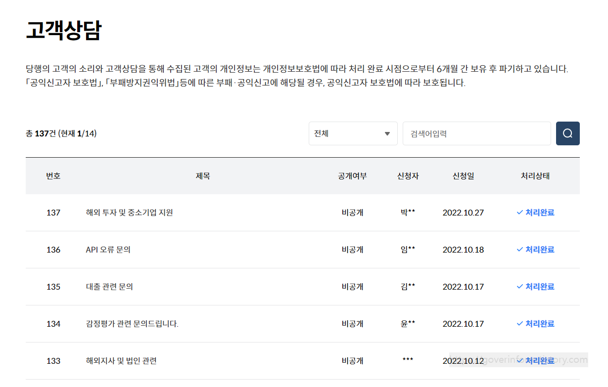 고객센터에 접속하면 다음처럼 고객상담 게시판이 나옵니다. 고객상담 게시판 첫화면에서 스크롤을 내리면 상담신청글을 작성할수 있습니다.