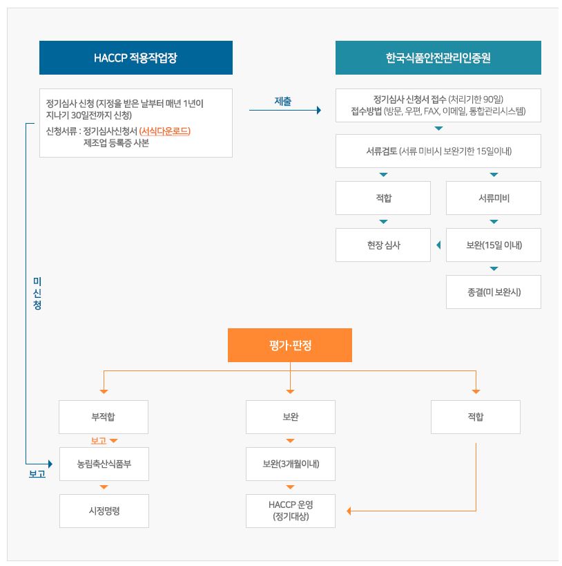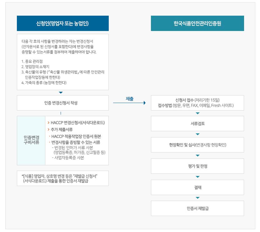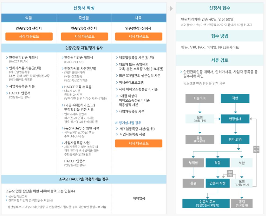 한국식품안전관리인증원 홈페이지에서 HACCP 적용업소 인증(연장) 신청이 가능합니다. 신청인(영업자나 농업인)은 신청서 작성 후 한국식품안전관리인증원에 접수하면 됩니다. 접수방법은 방문, 우편, FAX, 이메일, FRESH홈페이지이며 기관에서 서류검토 후 인증서를 교부하오니 참고 바랍니다. 신청절차 및 서식은 인증심사, 정기심사, 인증변경에 따라 상이하오니 하단 표를 참고하시기 바라며 인증심사나 연장심사 혹은 인증변경 시 비용이 발생하오니 하단의 표를 참고하시기 바랍니다.