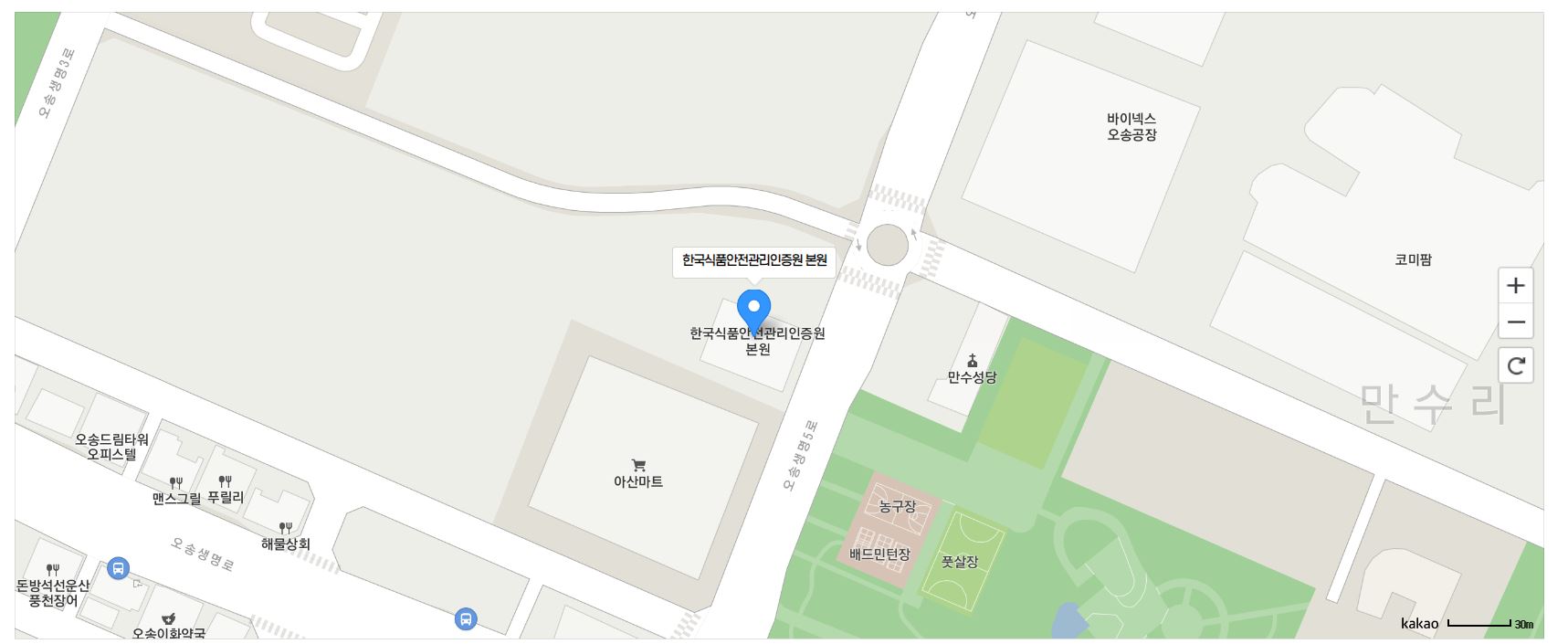 한국식품안전관리인증원 본원은 충북 청주시 오송읍에 위치하고 있으며 제주출장소, 강원출장소, 대전지원, 광주지원, 대구지원, 경인지원, 부산지원 등이 있으니 참고 바랍니다. 본원 방문시 경부고속도로는 청주 IC, 중부고속도로는 서청주 IC 이용 시 편리하며 오송역이나 조치원역 또한 본원과 가까우니 참고하시기 바랍니다.