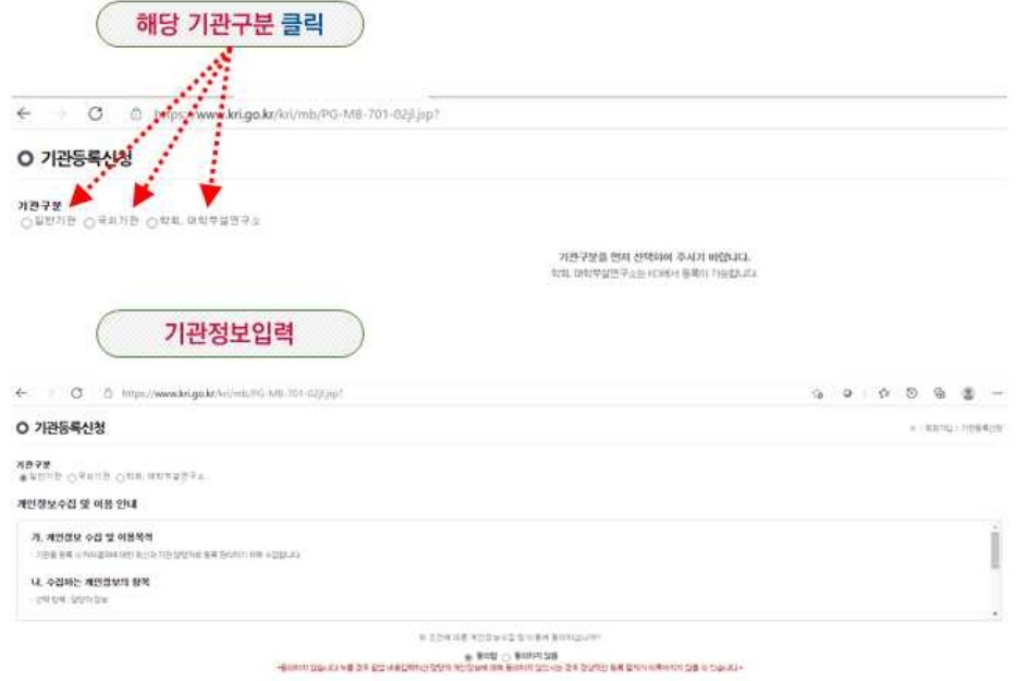 '해당 기관구분 클릭' 및 '기관정보' 입력을 합니다.