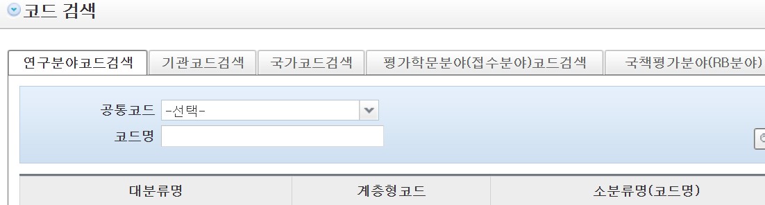 연구분야, 기관코드, 국가코드, 평가학문분야(접수분야), 국책평가분야(RB분야) 코드검색 서비스 이용이 가능합니다.