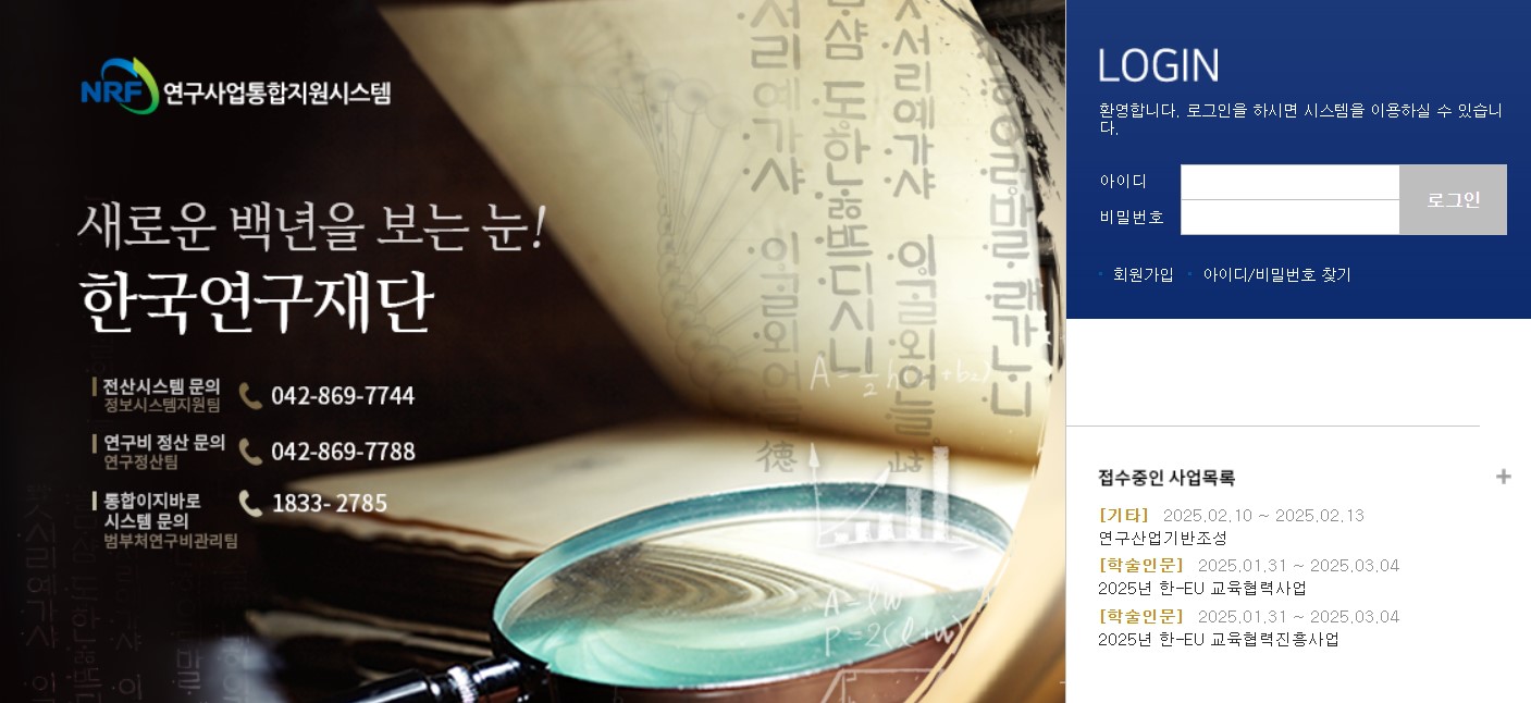 한국연구재단 연구사업통합지원시스템 홈페이지