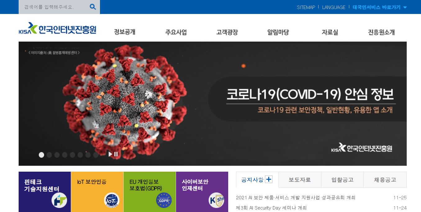 한국인터넷진흥원 홈페이지에 접속하면 아래와 같은 화면을 볼 수 있습니다.