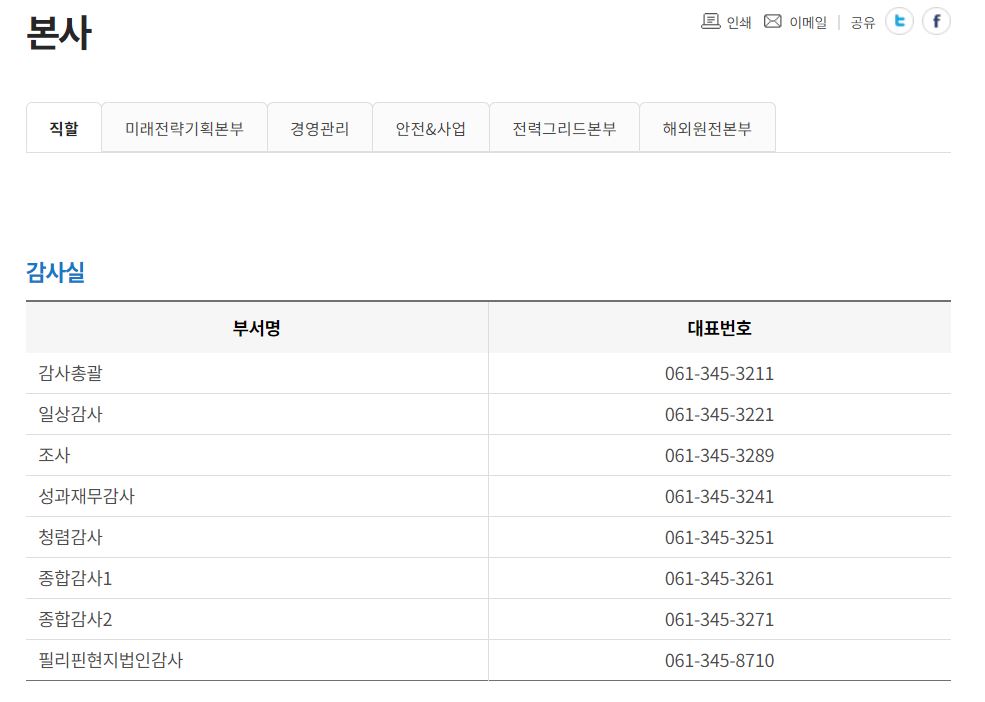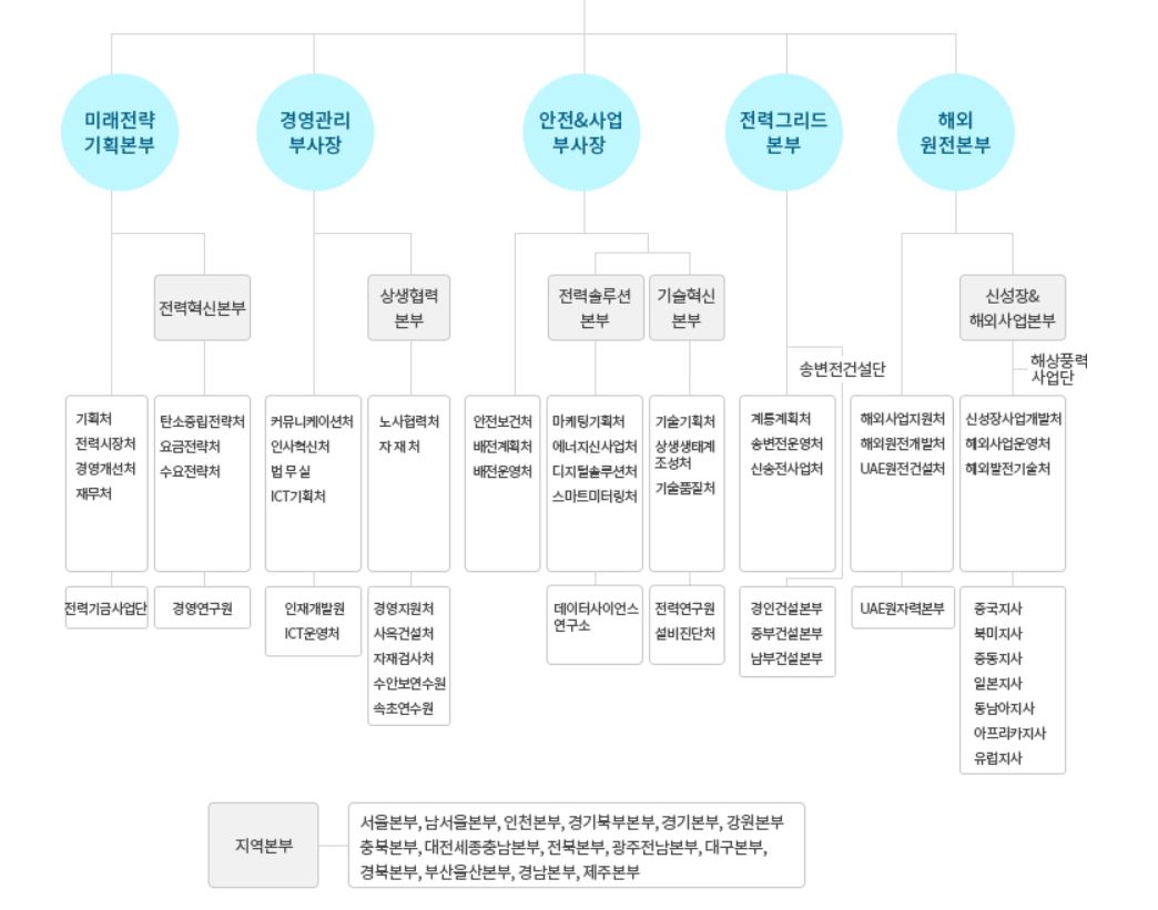 한국전력공사 부서명과 대표번호 확인이 가능합니다. (조직도 전체보기에서 확인 가능)