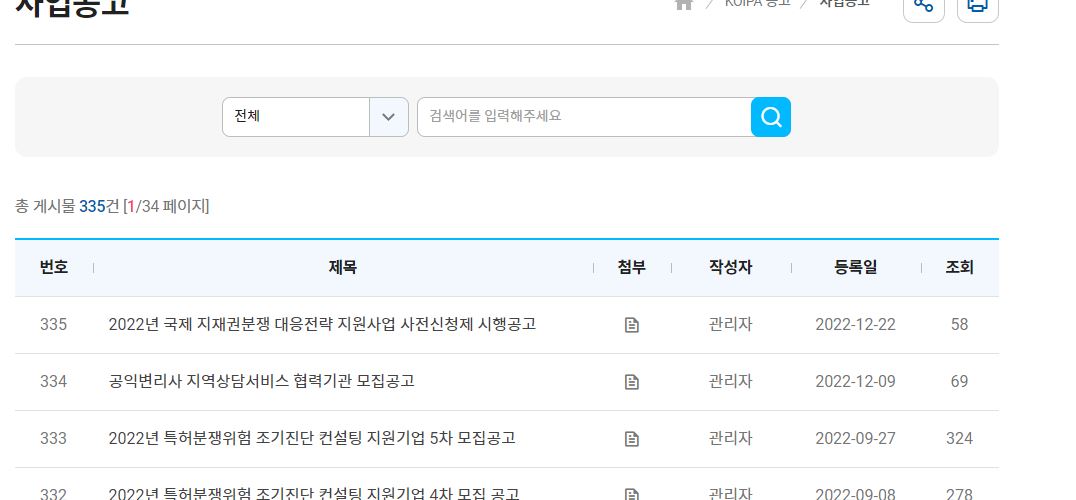 한국지식재산보호원의 사업공고 게시판입니다. 지원사업, 협력기관, 컨설팅 지원 등 모집공고가 올라옵니다. 관계자나 관심있는분들은 자주 확인하면 이곳에 한국지식재산보호원 사업공고가 모두 올라 오니 도움이 될것입니다.