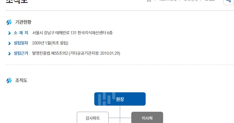 한국지식재산보호원은 2009년 1월에 설립하였으며 발명진흥법에 따라 기타공공기관으로 지정되어 설립하였습니다. 원장을 중심으로 이사회와 감사파트가 있습니다.